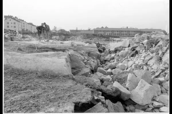 Drenering, boring og sprengning i fjellgrunn ved siden av Lambertseter stadion. Opparbeidelse av løpebaner. Lambertseter skole bak til høyre. Blokkbebyggelse i Glimmersvingen til venstre.