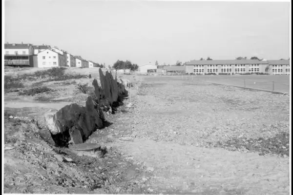 Opparbeidelse / Utplanering av felt for løpebaner på Lambertseter stadion. Lambertseter skole til høyre og blokkbebyggelse i Glimmersvingen til venstre.