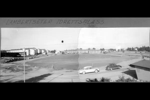 Friidrettsfeltet på Lambertseter stadion under fullførelse. Biler og kiosk ved med lysreklame for Cola og Solo ved Feltspatveien. Lambertseter skole, blokkbebyggelse i Glimmersvingen og høyblokka på Lambertseter senter i bakgrunnen.