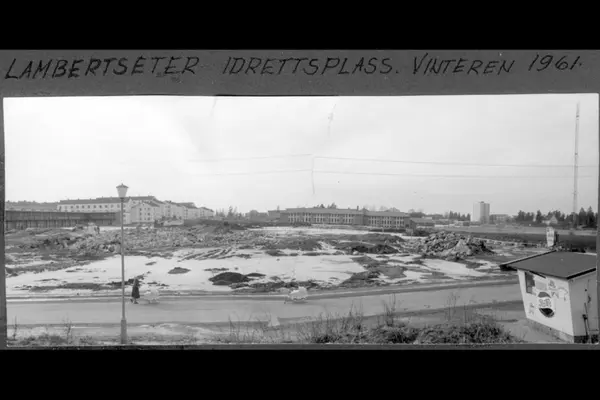Opparbeidelse av Lambertseter stadion. Hauger av fyllmasse (stein, sand og jord) til friidrettsfeltet. Mødre med barnevogner. Kiosk ved Feltspatveien med reklame for Pepsi-Cola, Solo, Diplomis m.m. Lambertseter skole, blokkbebyggelse i Glimmersvingen og høyblokka på Lambertseter senter i bakgrunnen.
