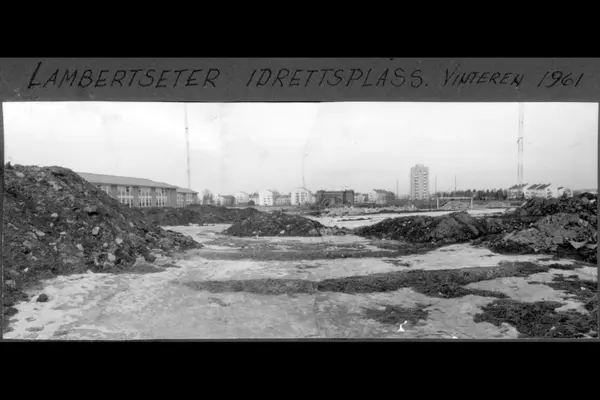 Opparbeidelse av Lambertseter stadion. Hauger av fyllmasse (stein, sand og jord) til friidrettsfeltet. Lambertseter skole, blokkbebyggelse i Antenneveien og Feltspatveien (inkludert høyblokka i Antenneveien 9) og NRK sine antennemaster (revet i 1975) i bakgrunnen.