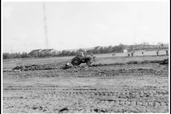 Påfylling og utplaning av jord på friidrettsfeltet på Lambertseter stadion. Traktor med skyffel. NRK sin antennemast (revet i 1975) i bakgrunnen. (Jfr. bilde A-20145/Ual/0013/022)