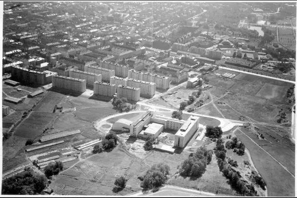 Panorama over Kringkastingshuset med Marienlyst-jordene (bl.a. dyrkingsparseller, minkfarm? og tyskerbrakker), Tørtberg og Majorstuen til Frogner og Frognerparken. (Flyfoto)