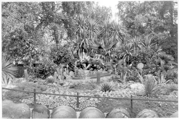Skulptur (statue) Løvegruppe plassert nord for bassenget. Skulpurgruppen ble gitt som gave av ingeniør C.M.Eger. Skulpurgruppen ble oppstit i 1891. Blomsterbed med kaktus og palmer. Sannsynligvis fra 1936.