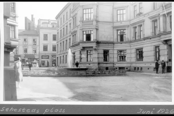 Sehesteds gate med Sehesteds plass og vannfontenen. Aschehoug forlags gård til høyre. Vinduene til Sadelmaker P.G. Løvenborg skimtes i Kristian Augusts gate 5.