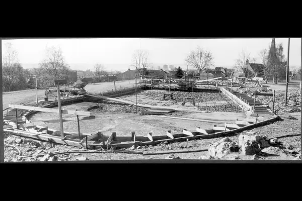 Stensparken. Opparbeidelse av vassebassenget / plaskedammen på toppen av parken. Sementlegging på armeringsjern lagt på stein- og grusunderlag. Forskaling langs kantene. Fagerborg kirke bak til høyre.