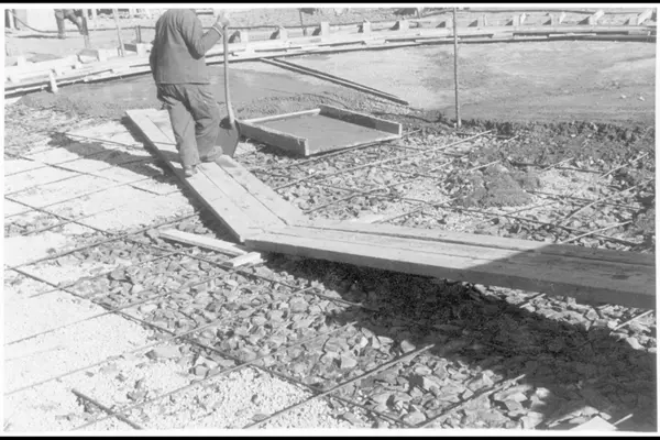 Opparbeidelse av vassebassenget / plaskedammen på toppen av parken. Sementlegging over armeringsjern lagt på stein- og grusunderlag. Forskaling langs kantene.