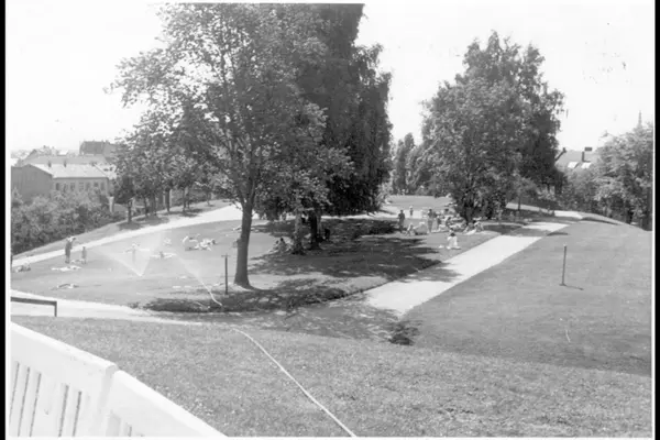 Nedre platå i parken med grusganger, parktrær og plener. Barn i lek. Barnevogner. Folk koser seg i skyggen. Skilt på plenen med teksten:" BRUKSPLEN". (Jfr. bilde A-20145/Uas/0010/024)