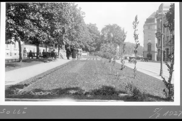 Parken med gangvei, plen og trær. Mennesker hviler på parkbenker. Drammensveien med biltrafikk. Østre hjørne av Det engelske kvarter. Albumtittel: "Solli Skarpsno"