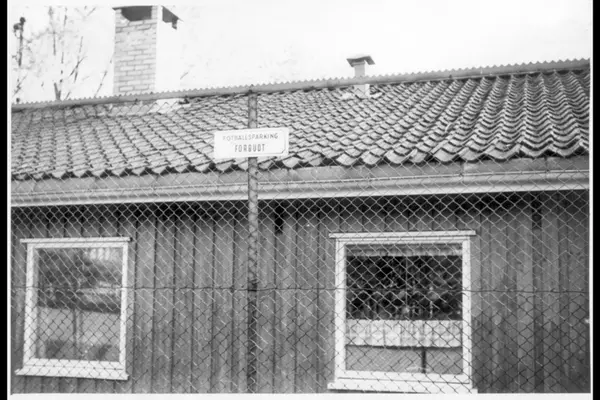 Trehus eller brakke bak nettinggjerde ved idrettsplassen på Sophus Bugges plass. Skilt med teksten: "FOTBALLSPARKING FORBUDT". Albumtittel: Sopus Bugges plass"