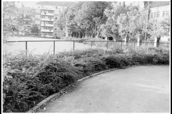 Hovedfasaden til Fagerborg gymnas (nåværende Fagerborg videregående skole) til høyre foran idrettsplassen omkranset av busker og trær. Bebyggelse i Fagerborggata i bakgrunnen. Albumtittel: "Sopus Bugges plass"