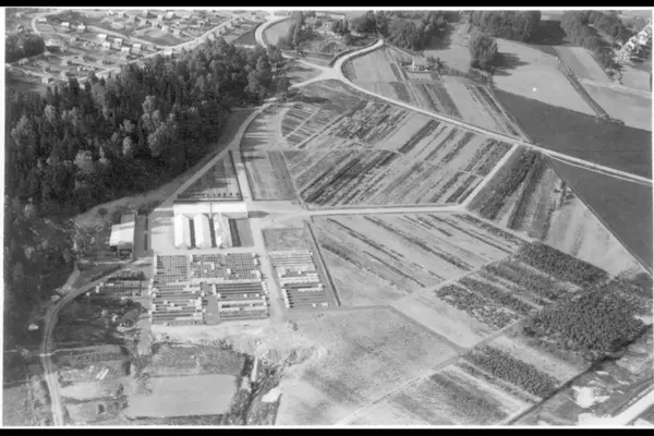 Oversiktsbilde av arealet med drivhus, plantefelt og veier. Sognsveien opp mot Solvang Kolonihage (hagekoloni) og Vestre Sogn gård. Fra Vestre Sogn kommunale gartneri (planteskole). Albumtittel: "SOGN GARTNERI" (Flyfoto)