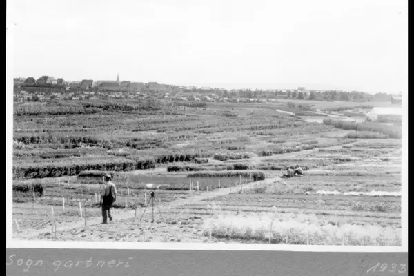 Plantefelt og drivhus sett mot syd. Arbeidere på området. Sogn Hagekoloni (kolonihage) og del av Ullevål Hageby i bakgrunnen. Fra Vestre Sogn kommunale gartneri (planteskole). Albumtittel: "SOGN GARTNERI"