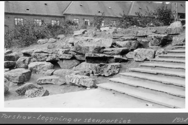 Hovedtrappen fra syd opp til Torshovparken. Steinblokker utplassert i hellingen ved opparbeidelse av fjellhage. Bebyggelse i Christies gate (nåværende Per Kvibergs gate) i bakgrunnen. Albumtittel: "Torshovparken"