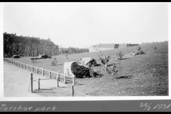 Østre del av Torshovparken sett mot sydvest. Nyplantede parktrær og utplasserte steinblokker. Bebyggelse i Christies gate (nåværende Per Kvibergs gate) og Johan Svendsens gate i bakgrunnen. Albumtittel: "Torshovparken"