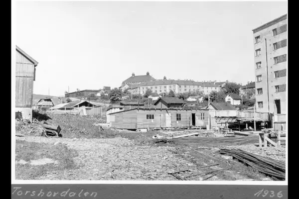 Vågebyveien 19. Rosenhoff skole. Del av Rosenhoffkvartalet. Rodeløkka kolonihager. Arbeidsbrakker. Byggearbeide pågår. Før opparbeidelse av området til park. Albumtittel: "Torshovdalen"