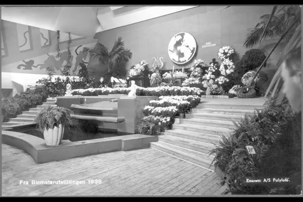 Utstillingsområdet med trapper og kunstig vannfall. Blomster og prydbusker på trappeavsatsene og langs veggen i bakgrunnen. Reklame for Norsk Blomstertelegraf på veggen i bakgrunnen. Postkort: A/S Polyfoto. Albumtittel: "Utstillinger"