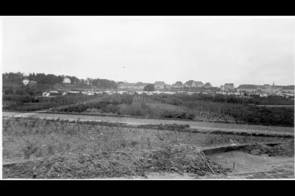 Dyrkingsfeltene på Vestre Sogn kommunale gartneri (planteskole) sett mot syd. Sogn Hagekoloni (kolonihage) og Ullevål Hageby i bakgrunnen. Albumtittel: "V. Sogn gartneri"