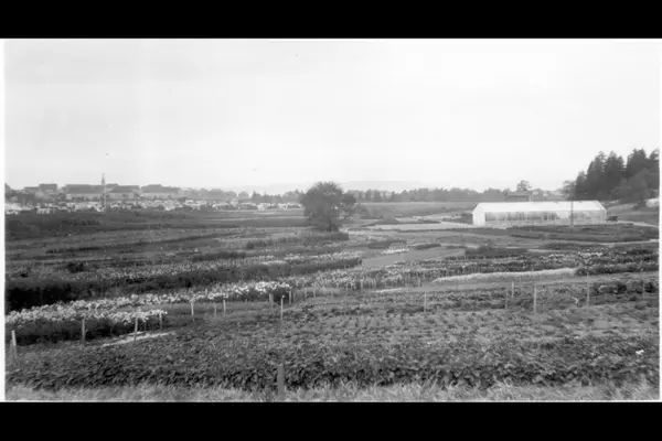 Plantefelt og drivhus på Vestre Sogn kommunale gartneri (planteskole) sett mot sydvest. Sogn Hagekoloni (kolonihage) og Ullevål Hageby i bakgrunnen. Albumtittel: "V. Sogn gartneri"