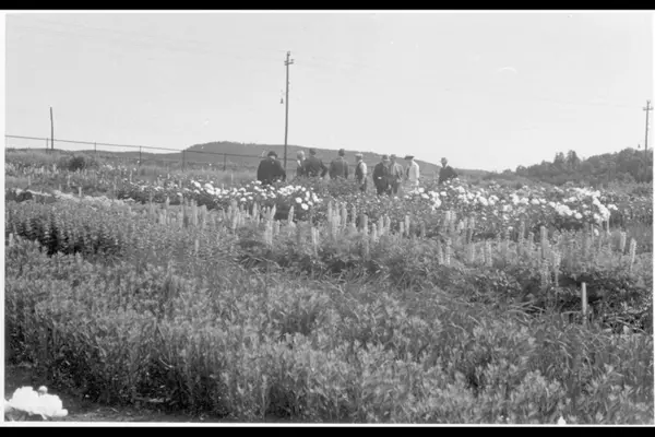 Parkutvalget på befaring i plantefelt på Vestre Sogn kommunale gartneri (planteskole). (Jfr. bilde A-20145/Uas/0028/025 og 028) Albumtittel: "V. Sogn gartneri"
