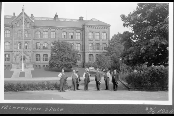 Vålerenga skole sett fra vest. (Sydlige del av hovedbygningen.) Østre del av Vålerenga park ved Hjaltlandsgata med parkbenker og parktrær. Herrer i finklær. Albumtittel: "Vålerengen Viktoria" (terrasse)