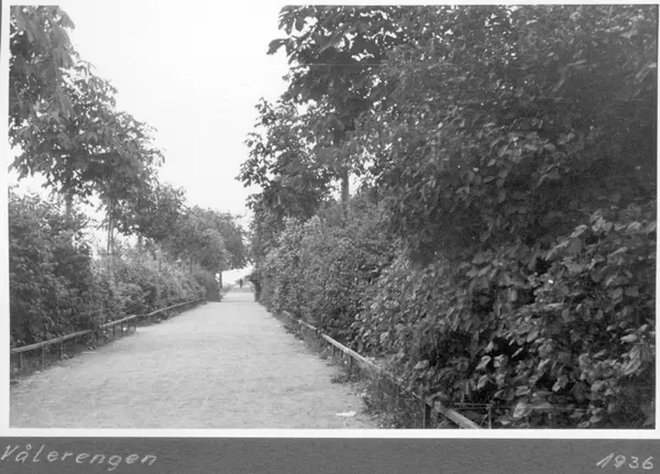 Grusgang / Gangvei i nordre del av Vålerenga park langs busker og parktrær. (Jfr. bilde A-20145/Uav/0006/014) Albumtittel: "Vålerengen Viktoria" (terrasse)