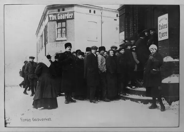 Mennesker i kø foran Gassverket, skilt med "Expedition Cokes Tjære", bygård i bakgrunn med skilt "Thv. Gaarder". Menneskene er godt kledd, vinter, snø på bakken. Ankertorget, Hausmanns gate.