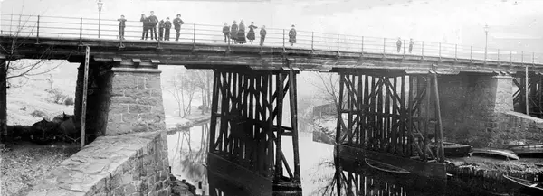 Brokarene til den gamle Ankerbrua, sett fra sørøst. Akerselva. Barn vendt mot fotografen. Bildet finnes ikke i original, men er en montasje av A-20189/U/001/027 og A-20189/U/001/028.