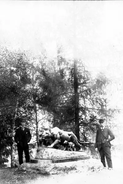 Statue i parken på St. Hanshaugen - "Løvinne med unger" - løve med to unger. To menn i dress og bowler ved siden av. Fra avdukingen i 1891? Stadsingeniøren - Fotografier af Kristiania (albumtittel). Ca 1892, basert på øvrige daterte bilder i samme album.
