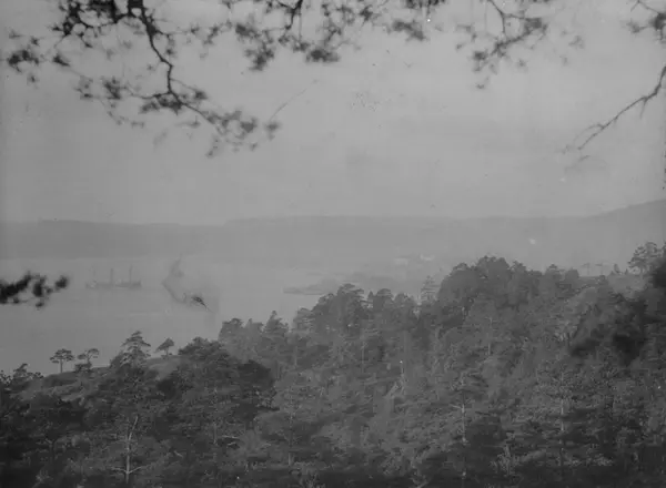 Utsikt fra Ekebergåsen mot Bispevika og Bjørvika. Skip for anker. Stadsingeniøren - Fotografier af Kristiania (albumtittel). Ca 1892, basert på øvrige daterte bilder i samme album.