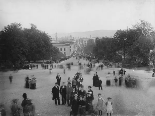Gatemiljø, fra Slottsbakken. Festpyntet Karl Johans gate. Stadsingeniøren - Fotografier af Kristiania (albumtittel). Ca 1892, basert på øvrige daterte bilder i samme album.
