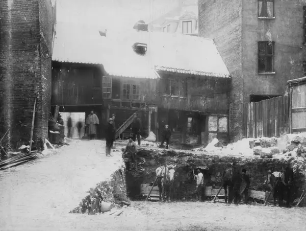 Bygård, bakgård. Utgravning av byggetomt. Hester med sleder for transport av utgravd masse. Stadsingeniøren - Fotografier af Kristiania (albumtittel). Ca 1892, basert på øvrige daterte bilder i samme album.