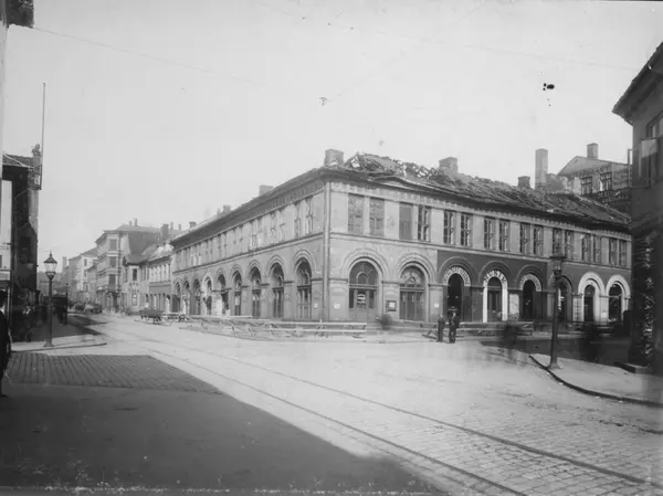 Gatemiljø, brannskadet bygård. Poseidon Søforsikringsselskab, Kirkegata 17. Butikkskilt. "Musik Instrument Strenge Piano Orgellager". Stadsingeniøren - Fotografier af Kristiania (albumtittel). 1890-årene, basert på øvrige daterte bilder i samme album. Strømledninger for trikk, som tilsier at bildet må være fra 1894 eller seinere.