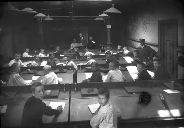 Klasserom med gutteklasse og deres lærer sett mot tavle og kateter. Klasse i annet år i forberedelsesskolen. Vaktmester Johan Jacobsen til høyre i uniform. Klassebilde.