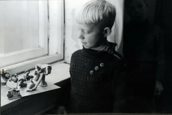 Gutt som viser fram figurer i leire han har laget. Elevarbeide. (Formingsundervisning). Albumtittel: "Sofienberg skole femti år - første september 1933."