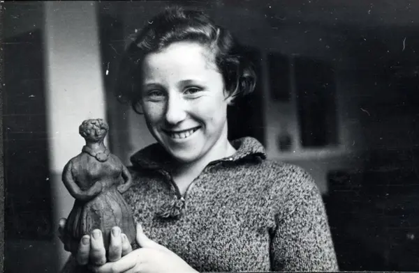 Jente viser fram en skulptur i leire hun har laget i formingstimen. (Merk spesiell ortografi i bildets originale tittel.) Albumtittel: "Sofienberg skole femti år - første september 1933."