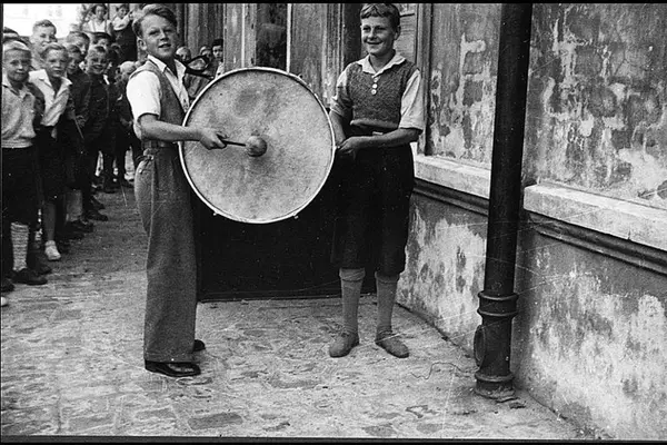 Elever i skolegården, to gutter bærer musikkorpsets stortromme. (Sofienberg skoles Guttemusikkorps) Albumtittel: "Sofienberg skole femti år - første september 1933."