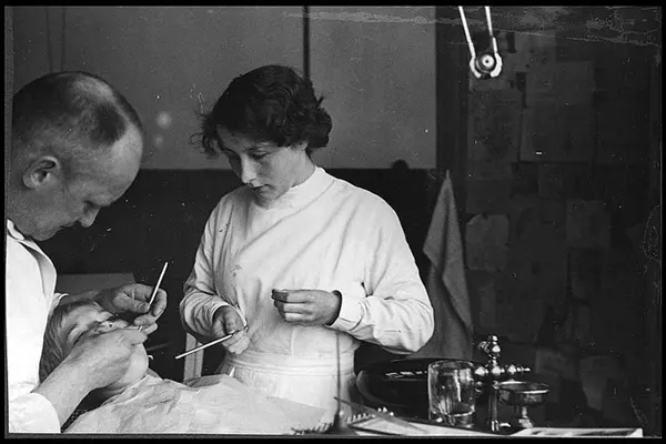 Skoletannlegen og tannlegeassistent undersøker tennene til en av elevene. Helseundersøkelse på skolen. Albumtittel: "Sofienberg skole femti år - første september 1933."