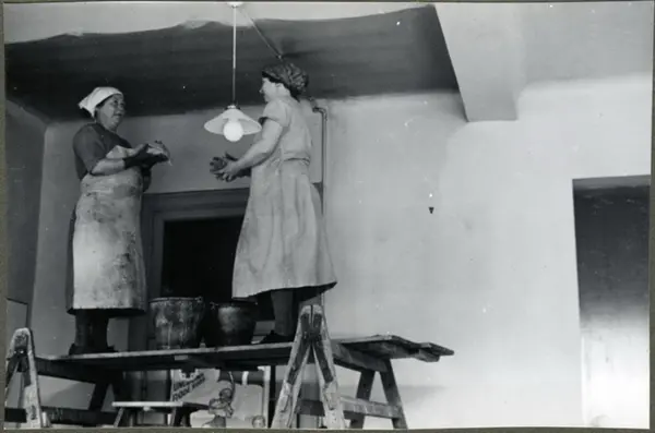 To kvinner i arbeide som står oppe på et bord med rengjøring av vegger og tak i klasserommet. Albumtittel: "Sofienberg skole femti år - første september 1933."