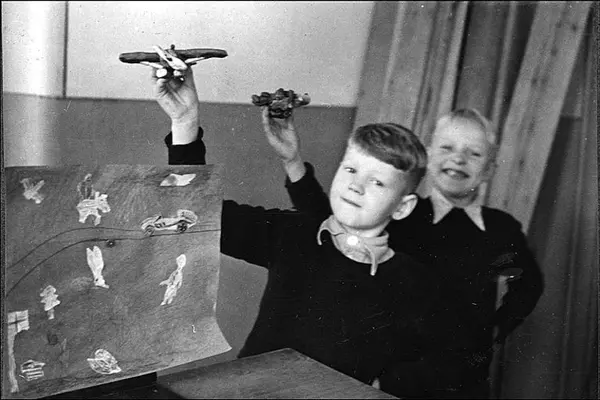 To gutter med modellfly i hendene. Albumtekst: "Just Nilsen, den forreste av guttene gikk i 2 kl, i året 1939, samme år som folkeskolenes landsutstilling fant ste. En oppfordring til skolebarn om å levere en tegning til en brosjyre som skulle utdeles på utstillingen. Just tegning vant og den ble trykket i 500 ekspl. Han tegnet inn alle slags kommunikasjoner i full bevegelse." (Formingsundervisning). (Merk spesiell ortografi i bildets originale tekst.) "Albumtittel: "Sofienberg skole femti år - første september 1933."