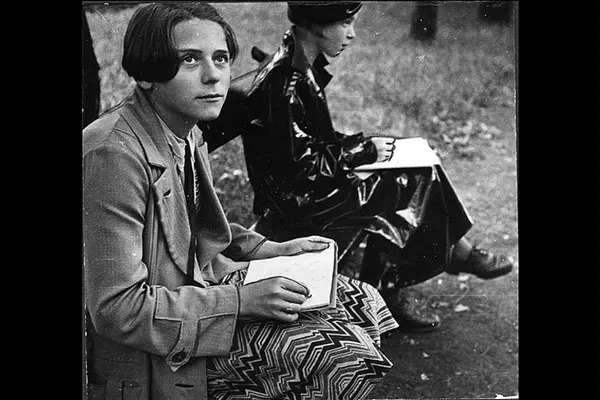 To jenter tegner i parken. (Formingsundervisning) (Botanisk hage) Bildet er forsøkt retusjert. Albumtittel: "Sofienberg skole femti år - første september 1933."
