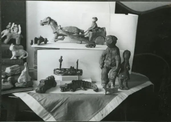 Albumtekst:" Endel forklaringer til enkelte figurer: Øverst gjødselkjøring. Liten pike hjelper blind mann. tømmerkjøring." Elevarbeider i plastilina fra skoleutstillingen. (Formingsundervisning). Albumtittel: "Sofienberg skole femti år - første september 1933."