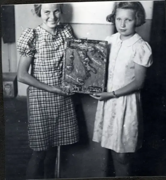 To glade jenter som viser fram sitt relieffkart på skoleutstilling. Albumtittel: "Sofienberg skole femti år - første september 1933."