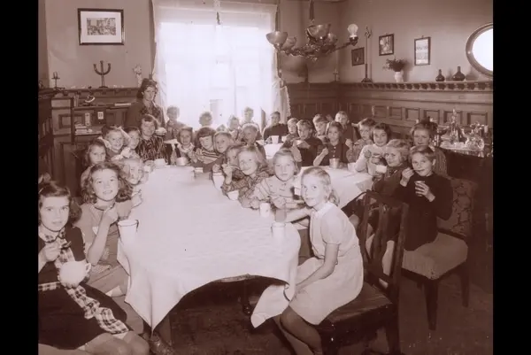 Danskehjelpens suppestasjoner i Oslo under okkupasjonen. Bolteløkken 3. fellesklasse. Klasseforstander Magnhild Torp. Bolteløkka skole var den skolen i Oslo som hadde spredd undervisningen mest under okkupasjonen. Her i Fru Ramdahls spisestue i 1944 (muligens 1942/43). Fruen tar selv på seg bryet med å koke og servere danskesuppe. I tilllegg fikk man tran og en skje ovomaltin til å bøte på smaken. Guttene sitter for seg og ble kaldt"Det urolige hjørnet".