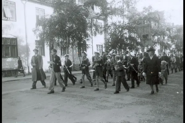 Fra Marcus Thranes gate. Prosesjon, skolekorps og Sagene skoles fane i forbindelse med første skoledag på "egen" skole etter frigjøringen. På vei til Sagene skole. Skolekorps, elever og lærere. Jf. A-40066/Ua/0003/003 og A-40066/Ua/0003/002.