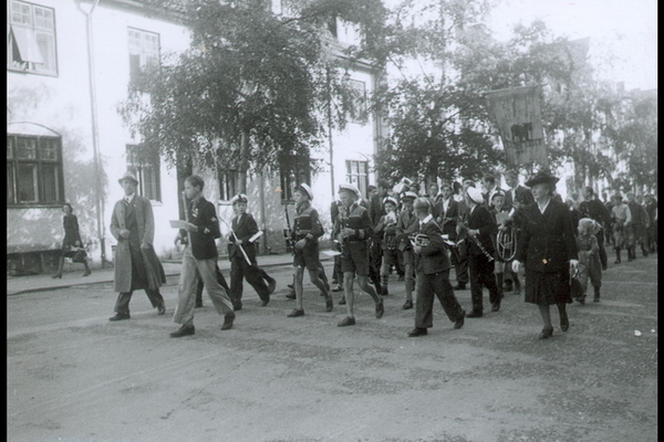 Fra Marcus Thranes gate. Prosesjon, skolekorps og Sagene skoles fane i forbindelse med første skoledag på "egen" skole etter frigjøringen. På vei til Sagene skole. Skolekorps, elever og lærere. Jf. A-40066/Ua/0003/003 og A-40066/Ua/0003/002.