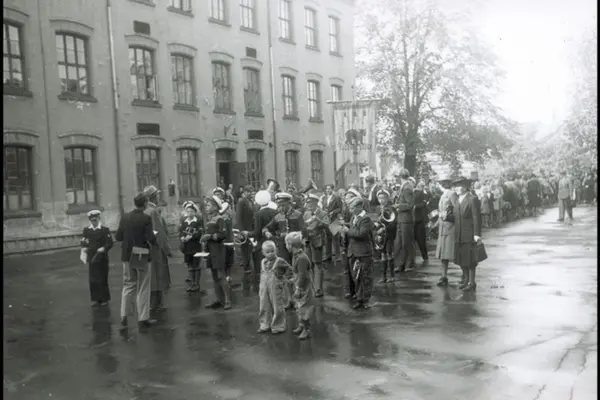 Guttemusikken på Sagene sammen med overlærer og rektor første skoledag på "egen" skole etter frigjøringen. Jf. A-40066/Ua/0003/003 og A-40066/Ua/0003/002.