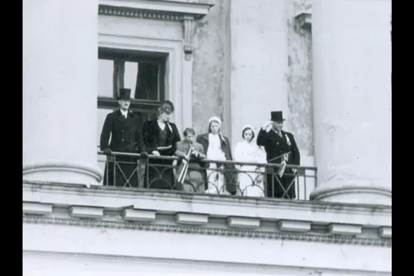 Kongefamilien på Slottsbalkongen 17. mai 1946. Kong Haakon VII, Kronprinsesse Märtha, Prins Harald, Prinsesse Ragnhild, Prinsesse Astrid og Kronprins Olav.