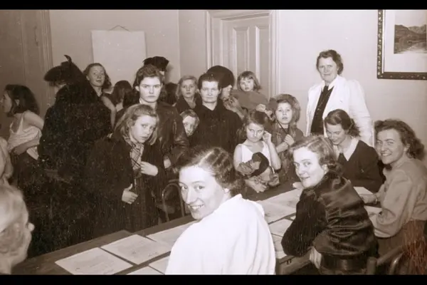 Oslo menighetspleiers fellesutvalg formidlet innbydelser og organiserte barnereiser under okkupasjonen. Barna fikk komme på landet "å fete seg opp". De ble sendt til bygder rundt i hele Sør-Norge. På dette bildet ser vi siste etappe av legeundersøkelsen før avreise. Barna får med seg instrukser til foreldrene samt merkelapp med eget navn, vertens navn og adresse. Foran til venstre Kirsten Ek, Liv Ellingsen, Kirsti Johnsen, Sigrid Brekke og Marit Bonnevie Svendsen. Stående til høyre: fru Titlestad (kasserer). Hvert barn betalt kr. 10,- for reisen.