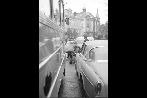Trikken venter på at feilparkert bil blir dyttet bort i krysset Riddervolds gate - Oscarsgate. Gården til høyre i bildet er "Marmorgården" i Riddervolds gate 3.